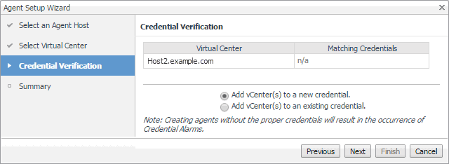 Add vCenter(s) to an existing credential: Select this option if you want to use an existing credential for the selected vCenter. This option is suitable if an existing credential has the information needed to access the vCenter. Click Next and continue to Step 9. |
