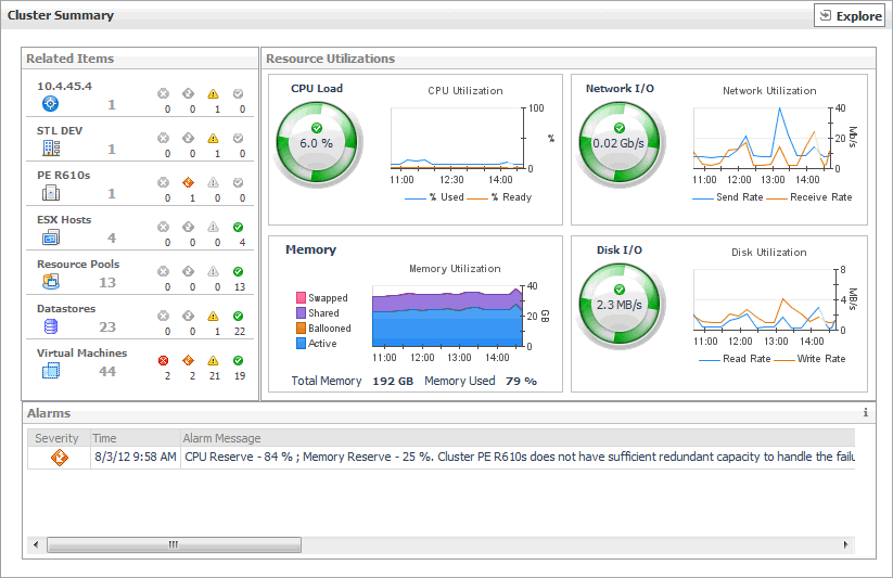 Shows the numbers and states of the cluster, ESX hosts, and virtual machines, all related to the selected cluster.