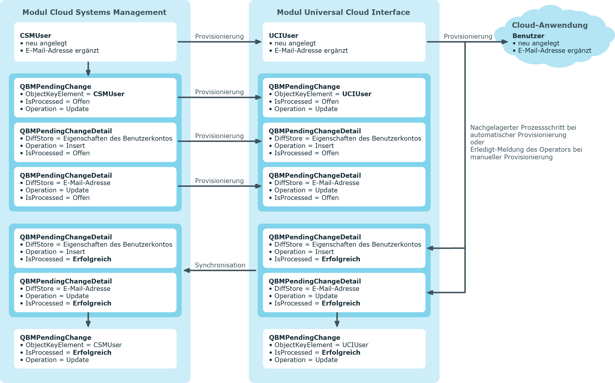 Folgende Grafik zeigt die Provisionierung von Objektänderungen und die zugehörige Verarbeitung der anstehenden Änderungen. Der Ablauf ist für automatische und manuelle Provisionierungsvorgänge identisch und ist unabhängig davon, ob die Module Cloud Systems Management und Universal Cloud Interface in der selben oder in separaten Datenbanken installiert sind.