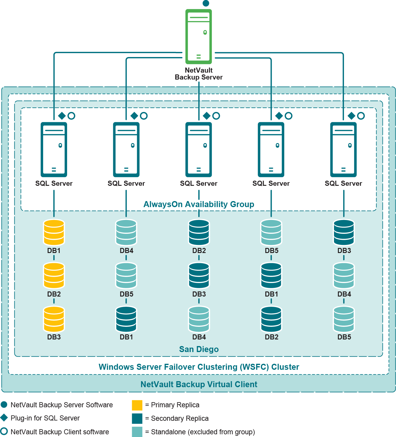| IMPORTANT : dans la terminologie de NetVault Backup, un nœud de cluster est appelé un client virtuel. Les références au client virtuel dans Plug‑in pour SQL Server sont essentiellement des références au serveur virtuel dans l’environnement de cluster de basculement SQL Server ou le groupe de disponibilité AlwaysOn. |