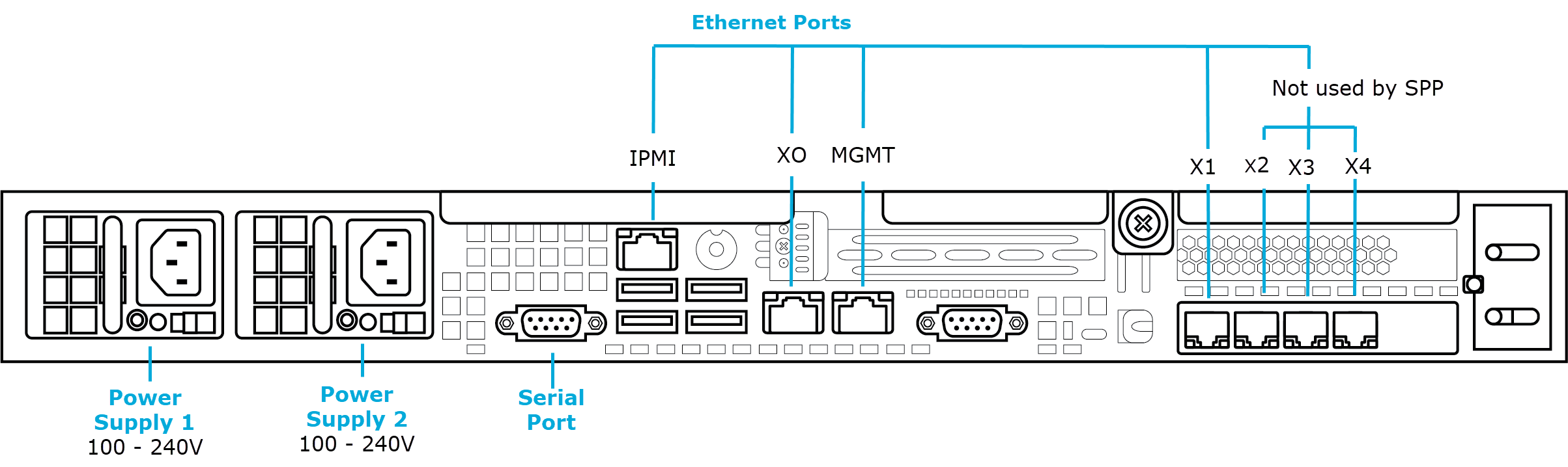 The following diagrams show the front and back panels on the One Identity Safeguard for Privileged Passwords 3000 Appliance and 2000 Appliance.