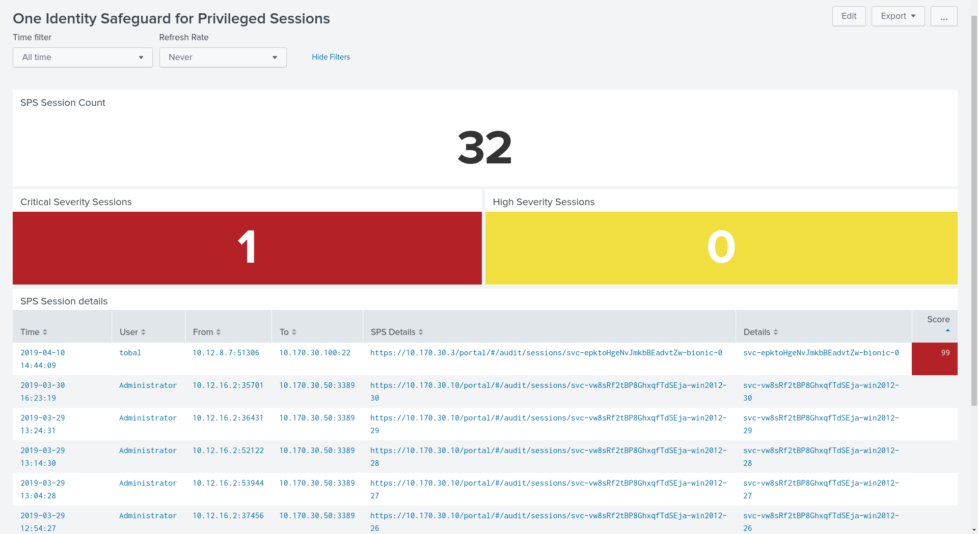 The One Identity Safeguard for Privileged Sessions dashboard visualizes data from SPS (including your events parsed and indexed by the Splunk Add-on and the metadata that the Splunk Add-on attaches to those events).