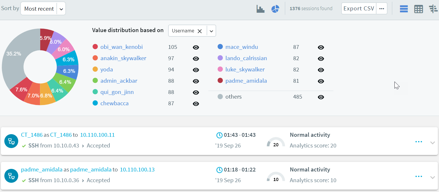 You can quickly sort and visualize the distribution of the sessions based on their various metadata, for example, username, server address, and so on.