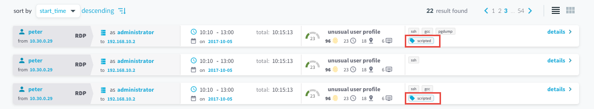 Scripted session tag: One Identity Safeguard for Privileged Sessions (SPS) currently supports the scripted session tag. SPS uses One Identity Safeguard for Privileged Analytics to detect if sessions are generated using human interaction or automation. If sessions are generated using automation, SPS displays the scripted tag in the search interface as shown below:
