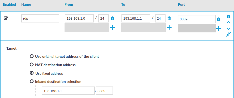 The Target section allows you to configure Network Address Translation (NAT) on the server side of SPS. Destination NAT determines the target IP address of the server-side connection. You can set the destination address as required for your environment. For this example non-transparent connection, select Use fixed address.