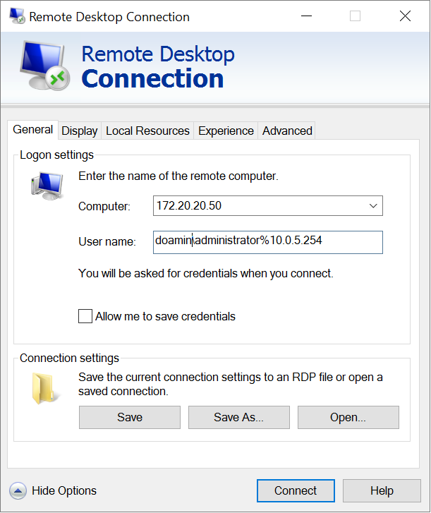When encoding the address of the destination server in the username, there are a few points to keep in mind. Since most RDP client applications limit which special characters can be used in usernames, this is not always intuitive.