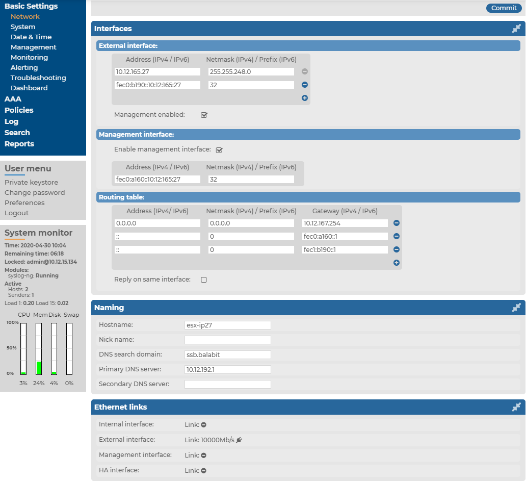 • Interfaces > Management interface: The adress and netmask / prefix of the SSB network interface used to access the SSB web interface. If the management interface is configured, the web interface can be accessed only through this interface, unless: