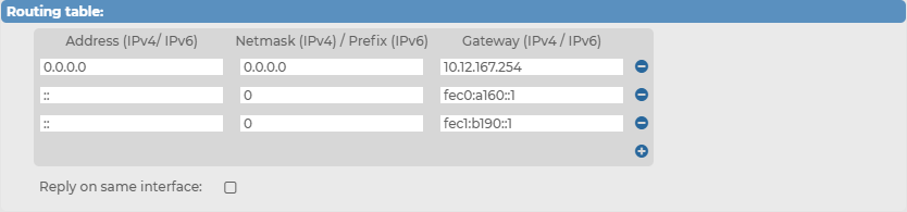 1. To add a new routing entry, navigate to Basic Settings > Network > Interfaces and in the Routing table field, click .