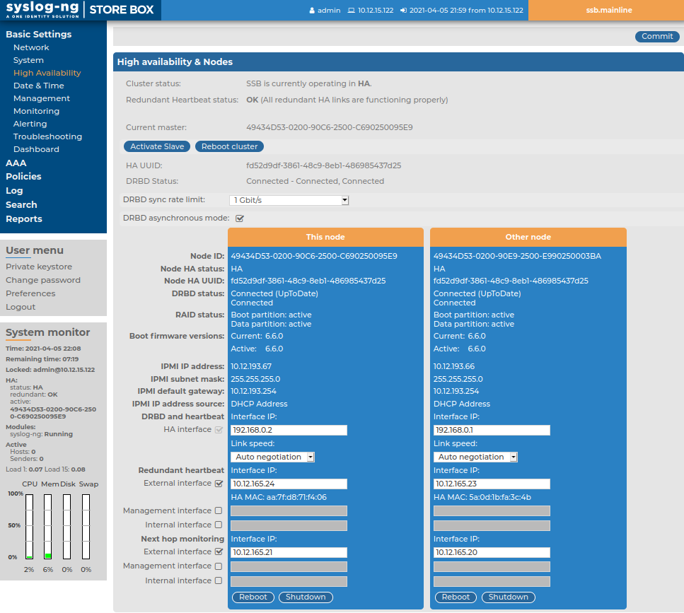 The primary node shares all data with the secondary node using the HA network interface (labeled as 4 or HA on the SSB appliance). The disks of the primary and the secondary node must be synchronized for the HA support to operate correctly. Interrupting the connection between running nodes (unplugging the Ethernet cables, rebooting a switch or a router between the nodes, or disabling the HA interface) disables data synchronization and forces the secondary node to become active. This might result in data loss. You can find instructions to resolve such problems and recover an SSB cluster in Troubleshooting an SSB cluster.
