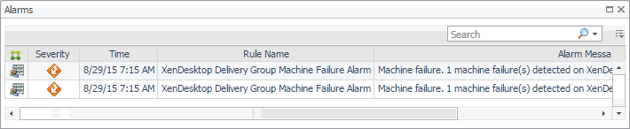 The top part of this dashboard shows the counts of alarms grouped by object type against which the alarms are generated: Agents, Infrastructure, Delivery Groups, Desktops, Applications, Users, and vSphere.