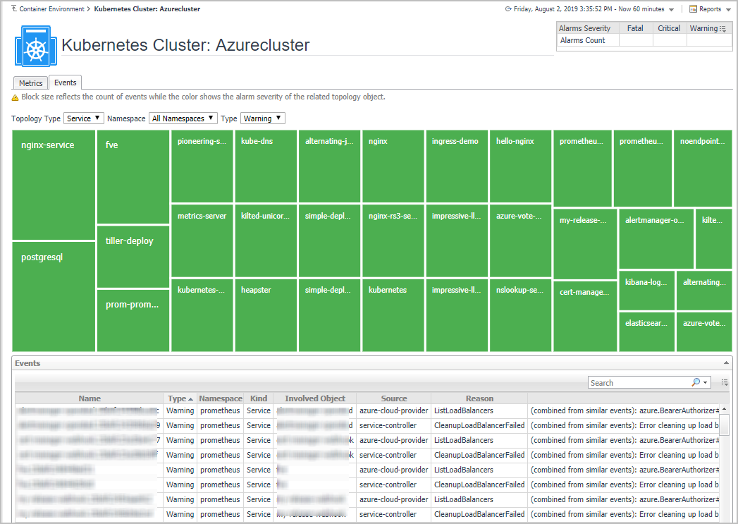 Events: The events occur on the selected Kubernetes cluster over a selected period of time, which includes: |