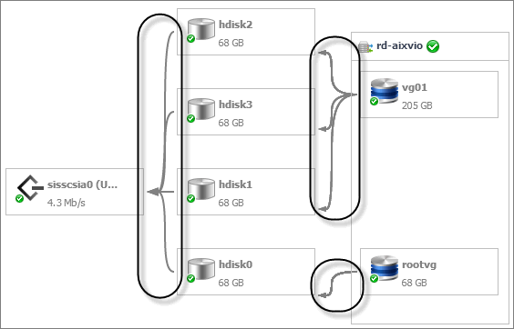 In addition to Highlight dependency, some object types offer other options when selected. For example, when you click a partition, you can click Check partition details to drill down on the partition, or Expand partition or Collapse partition for contained adapters to show or hide the network adapters the selected partition uses.