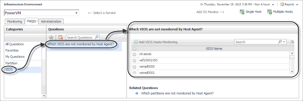 In the Which VIOS are not monitored by Host Agent pane, select a VIOS, and click Add VIOS Hosts Monitoring. |