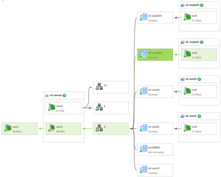 To navigate to dependency views, in the Selected Service PowerVM view, select a PowerVM® partition, managed server, or PowerVM VIOS, and click Explore. Open the Memory tab (managed servers only), Storage tab, or Network tab, and then open the Dependencies tab.