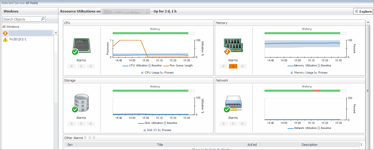 From the Resource Utilizations view for a monitored host you can drill down into more detailed alarm views, by clicking a specific alarm icon.