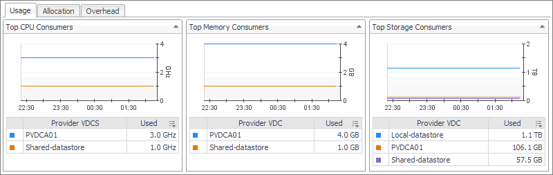 These views identify the elements that consume the highest amount of system resources. They can help you learn about the resource levels used by all organizations, organization vDCs, or provider vDCs in your environment, and to identify and prevent potential bottlenecks by reallocating resources where they are most needed. These summary views appear on the right of the Quick View when you select the Organization, Organization vDCs, or Provider vDCs tile.