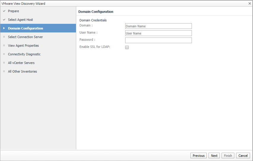 Domain. Fully-qualified name of a domain to search for the View Connection Server. For example, myDomain.com. |