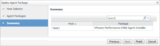 In the Deploy Agent Package wizard, on the Summary page, verify that the host name and package are correct, and click Finish. |
