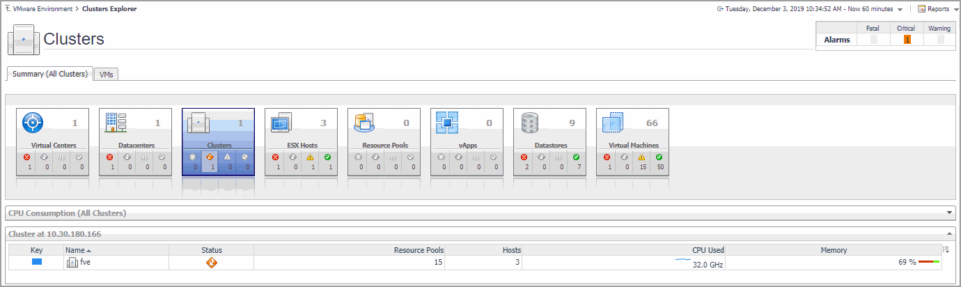 The VMware Explorer’s Virtual Environment view displays a high-level overview of your virtual environment. The view has a tile for each object type: Clusters, Servers, and Virtual Machines. Each tile shows how many of the corresponding object instances there are in your virtual infrastructure, as well as the count of objects of that type in each of the alarm states (Normal, Warning, Critical, Fatal). |
