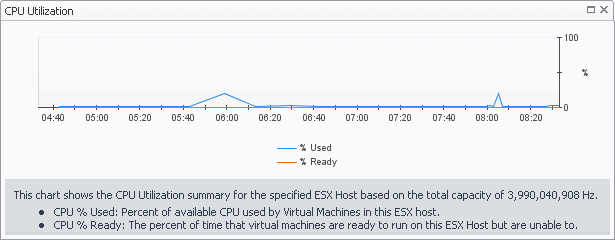 The ESX Host Summary view shows the overall resource utilization and the amounts of system resource consumption for a physical ESX host.