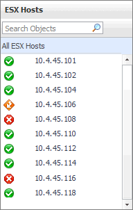 This tree view lists the ESX hosts that exist in your environment and shows their state.
