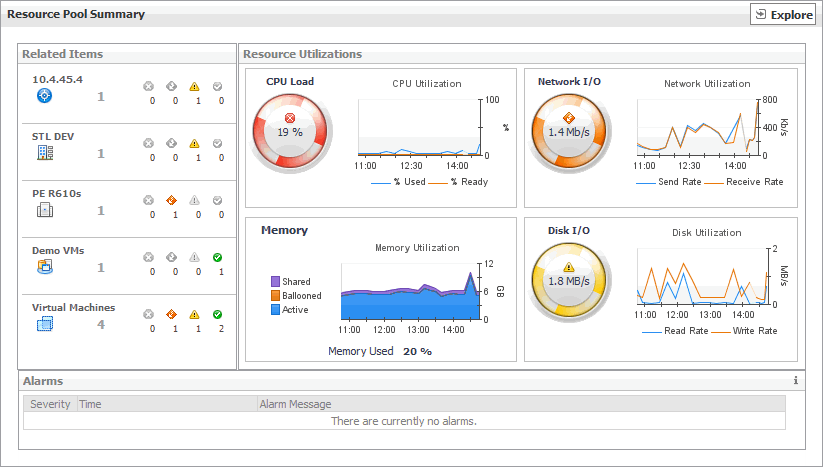 Virtual Machines. The number of virtual machines that are associated with the selected resource pool, followed by the related alarm counts. | |