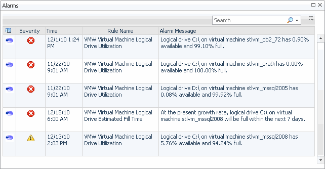 Alarm count. Displays the Alarms dialog box that shows a list of all related alarms. For each alarm entry, it shows its severity, the time at which it was triggered, the rule name that triggered the alarm, and the alarm message. |