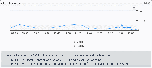 CPU Utilization, % Ready. The percentage of the virtual machine’s CPU resources that is ready to execute system code and user programs during the selected time period.