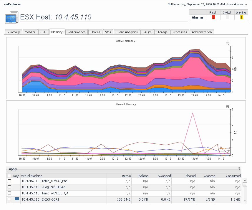 The VMware Explorer’s Memory tab displays the combined memory utilization for an ESX host, showing the amount memory used by each virtual machine that is running on that host. This includes the amount of active and shared memory in GB, all during a selected time period.