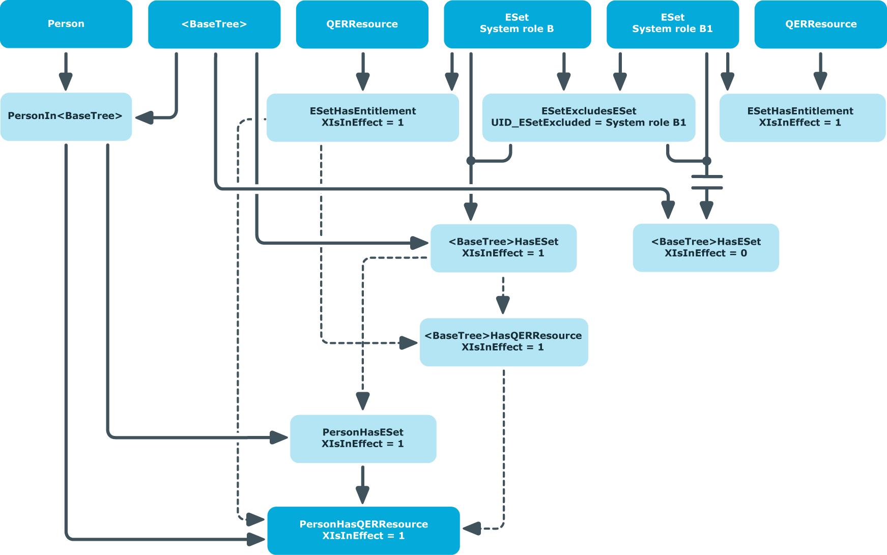If the configuration parameter is not set, the system roles whose assignments are in effect (BaseTreeHasESet.XIsIneffect = 1) are split in the inheritance calculation for the hierarchical roles. If the excluding system roles are assigned to different hierarchical roles, both assignments are effective. This makes the resulting company resource assignments to hierarchical roles also effective. If an employee is a member of both hierarchical roles, the company resources of the excluded system role are inherited by this employee.