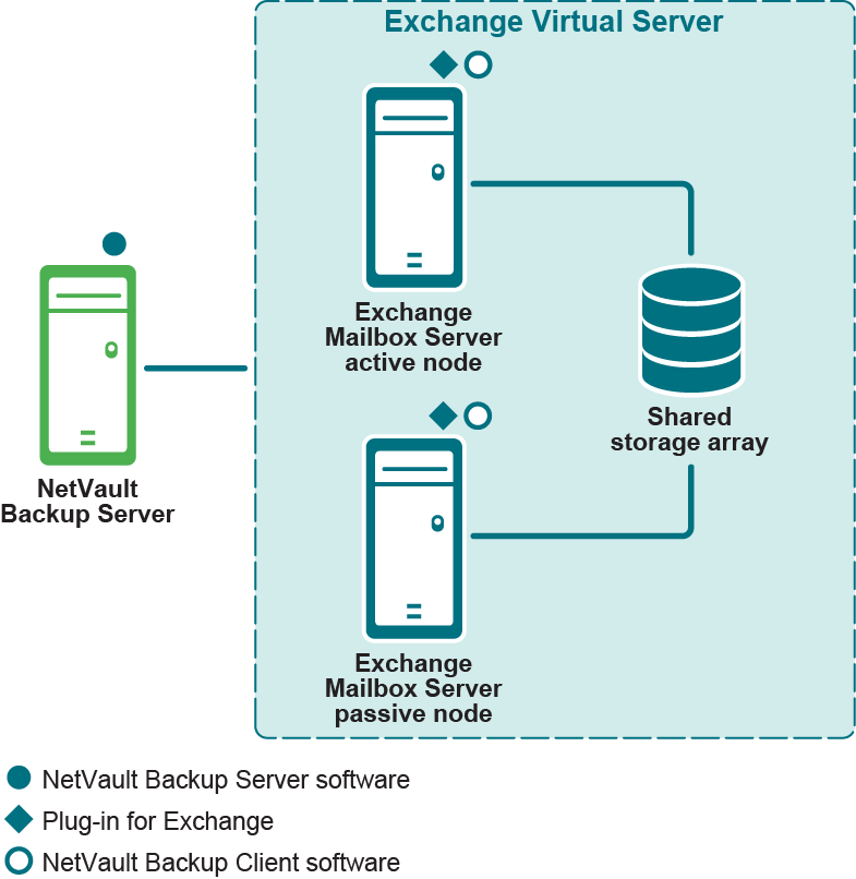 In a CCR deployment, the plug-in is installed on the Exchange Virtual Server. The Exchange Virtual Server is a group of nodes and hosts that make up the cluster. The NetVault Backup Server sees the cluster as a single client, which is called a Virtual Client. When installing the Plug‑in for Exchange on the Virtual Server, the plug-in is installed on all nodes by using NetVault Backup’s Cluster Support. NetVault Backup’s Virtual Client is used to back up either the Active or Passive node, which in this example is the Exchange Virtual Server.