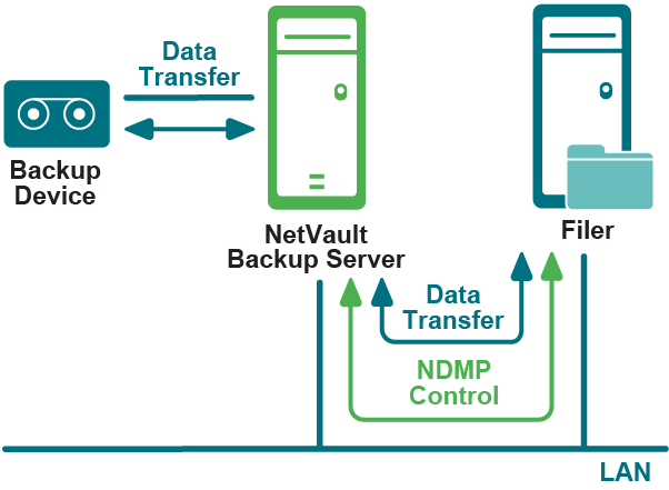 In this model, the NetVault Backup Server instructs the filer to perform backups to the NDMP-compliant network-attached storage device. The filer uses NDMP over the network to transfer the data to the storage device and backup index information to the NetVault Backup Server. The network-attached storage device can be shared by one or more filers, NetVault Backup Server and any number of NetVault Backup Clients.
