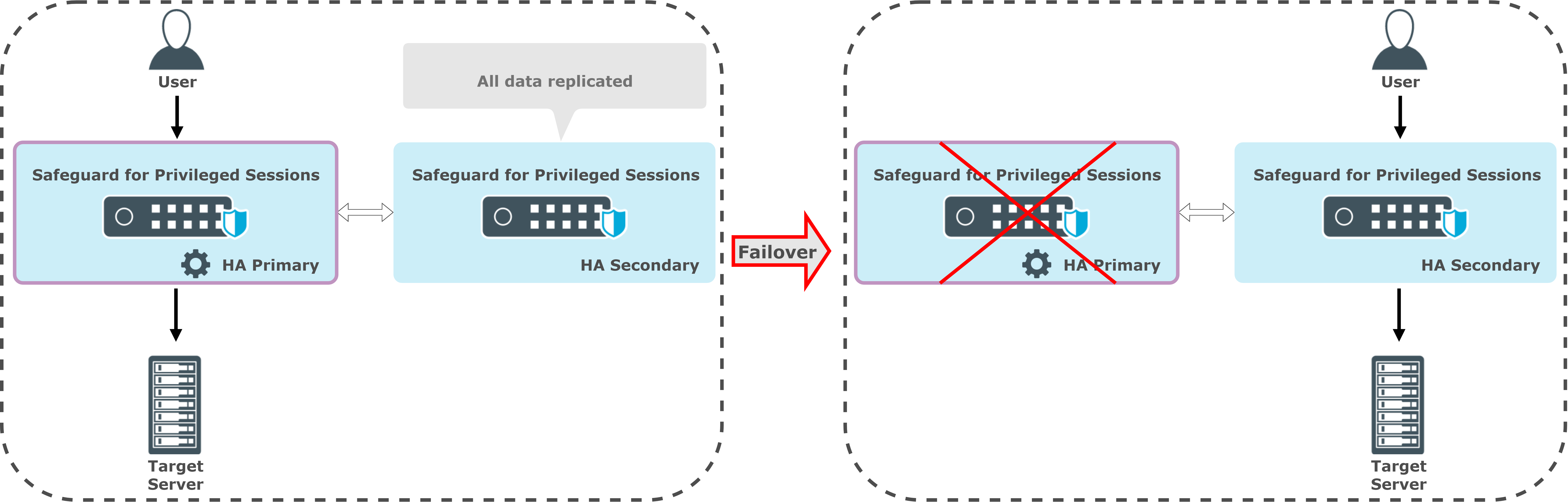 In case of physical appliances, add a hot-spare pair to every appliance to ensure high availability (HA). Place the two appliances ideally adjacent to each other and connect them with a direct cross cable. The secondary node in the pair replicates the entire disk contents of the primary node, including all configuration and audit recordings. The secondary node keeps all of its outside network connections in a disconnected state and serves no traffic until it takes over the role of the primary. You can initiate takeovers manually, or they are performed automatically if the primary node does not reply to the periodic heartbeat checks.