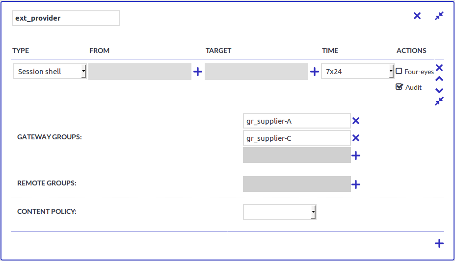 In this scenario, only users of gateway groups gr_supplier-A and gr_supplier-C are audited when requesting a new SSH session shell channel. If these two groups are not matched, the second rule matches and no recording is triggered. Without the second rule, users that do not match the specified groups would be denied by this channel policy.