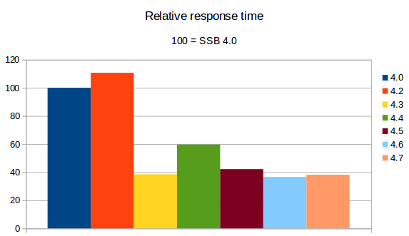 The following charts show how the search performance of SSB has improved, using SSB 4 LTS (4.0) as a baseline. We used relatively longer queries, where the response time was at least 2 seconds, so that the results are easier to measure and compare. Otherwise, various other factors could have distorted the measurements. Note the following point:
