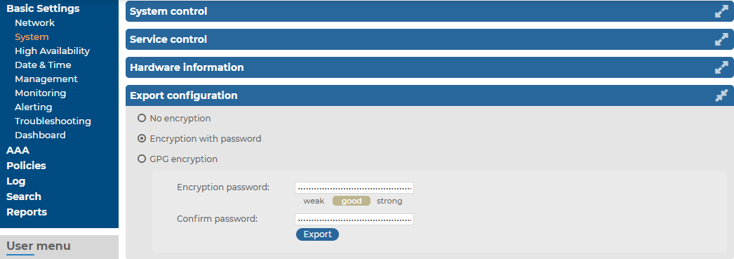 Figure 12: Basic Settings > System — Exporting the SSB configuration